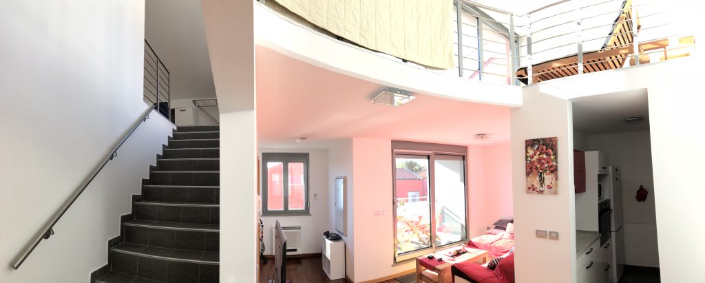 The penthouse-like apartment invites plenty of natural light into the living area, illuminating the entire space from the top tier, where the terrace and gallery are located.